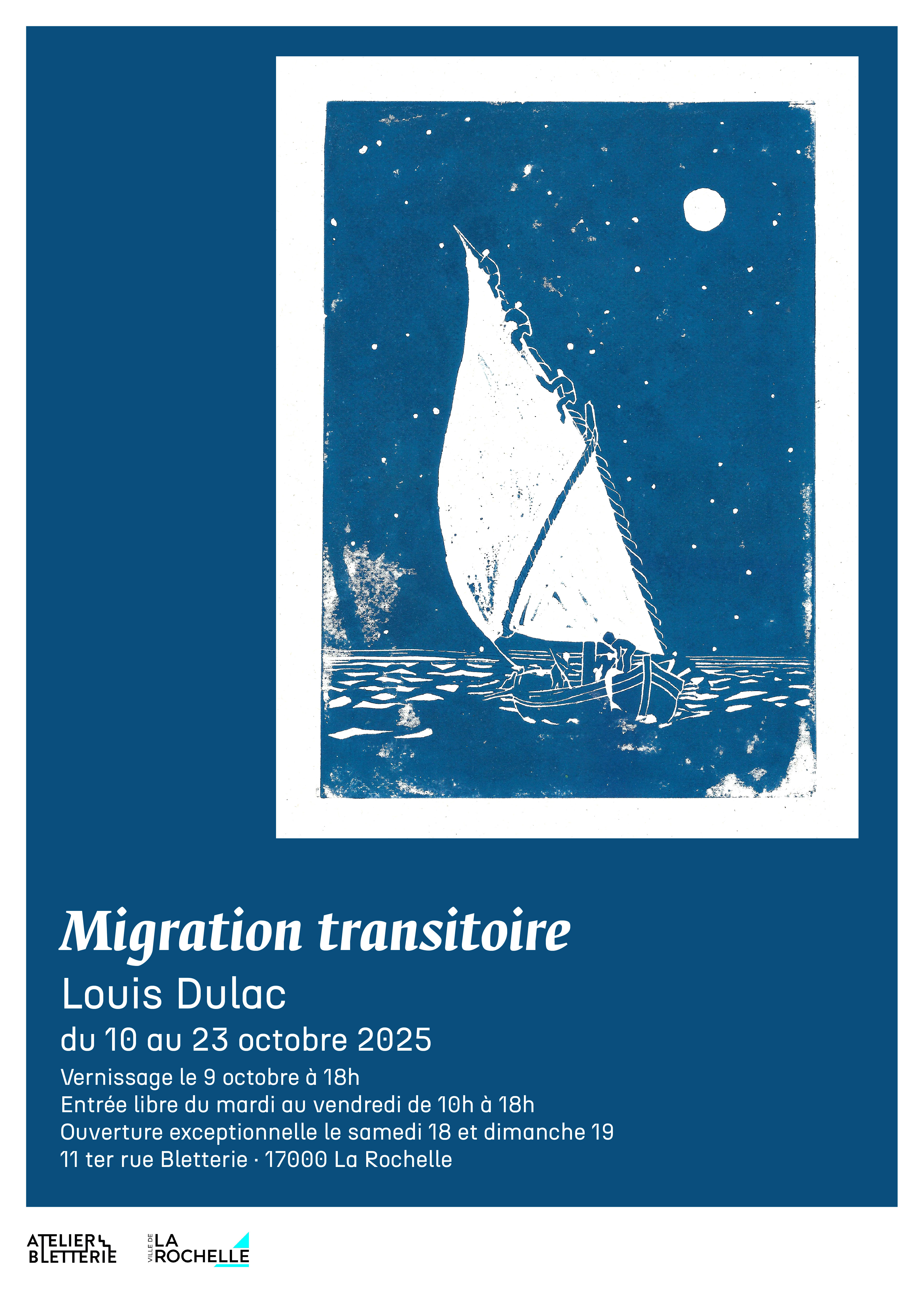 Migration transitoire Une exposition de Louis Dulac Du vendredi 10 au jeudi 23 octobre 2025 « Il était une fois. Petit garçon, je jouais avec un ami dans un terrain vague. Le soir approchait, le soleil était déjà très bas sur l’horizon, lorsqu’il me regarda et me dit, d’un air grave mais serein : “Il est temps d’y aller.” Sur le moment, encore euphorique, je compris qu’il fallait simplement rentrer chacun chez soi, et je pris ses mots au pied de la lettre. Ce n’est que le lendemain, lorsque je revins seul sur le terrain, que je réalisai, dans le silence de son absence, qu’il parlait en réalité de l’appel de la route. Il était probablement déjà loin, en chemin vers une destination, une région qui m’était inconnue… » La sédentarisation n’est qu’une illusion. Au-delà des mers et de la ligne d’horizon, le besoin de se déplacer pour se découvrir, à travers autrui – animal ou végétal –, à travers l’ailleurs, est un besoin vital. À la lisière du bois, sur le littoral charentais, Louis Coiffard Dulac sculpte, taille, grave, compose avec les différentes matières qui l’entourent, dans le but de raconter des histoires. Souhaitant être, et faire, le lien entre différentes générations, il se fait l’oreille et les mains à l’écoute et au service du Vivant.Entre sculpture et gravure, Il invente de nouvelles formes de fables. instagram : https://www.instagram.com/louis_c.dulac/ |